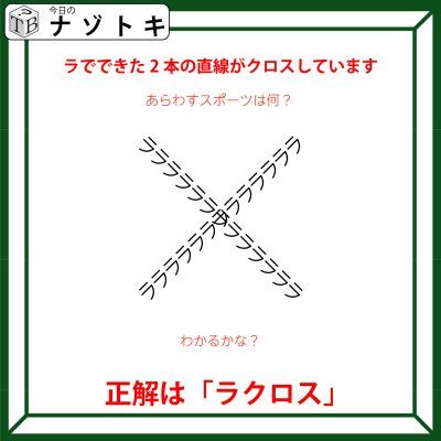 ここから連想されるイラストは何でしょうか?「ラ」を「クロス」しているということ。そうです!「ラクロス」です。というわけで正解は「ラクロス」でした。