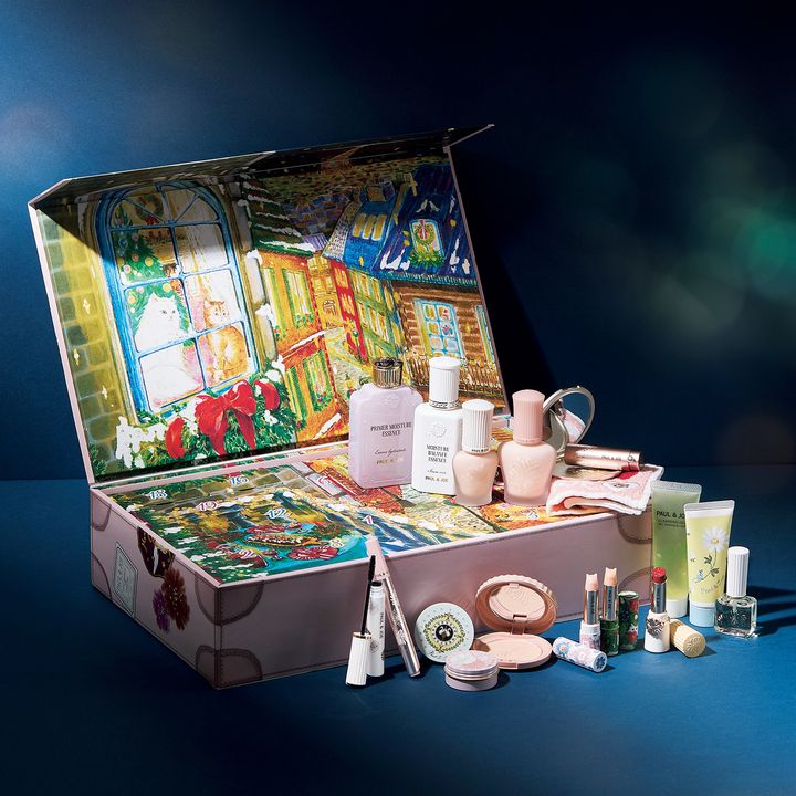 ピンクのトランク風ボックスにはブランドのアイコンアイテム「モイスチュアライジング プライマー」をはじめマスカラやリップスティックの現品サイズがたっぷり。この時期にぴったりの潤いを巡らせる美容液やボディソープ、ネイルオイルも揃い、全身を丸ごとケア。毎年楽しみな雑貨も多数セットで見逃せない。ポール & ジョー アドベント カレンダー 2025 ¥33,000(ポール & ジョー ボーテ)