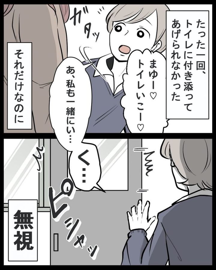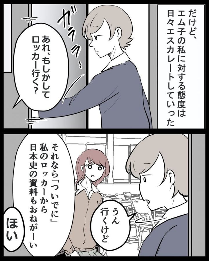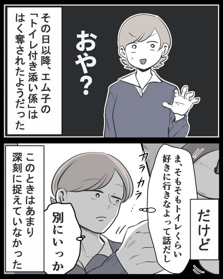 ある日の休憩時間、エム子に「トイレに行こう」と言われるも、ちなきちさんは課題を優先してしまったことで、友情関係に変化が起きる。