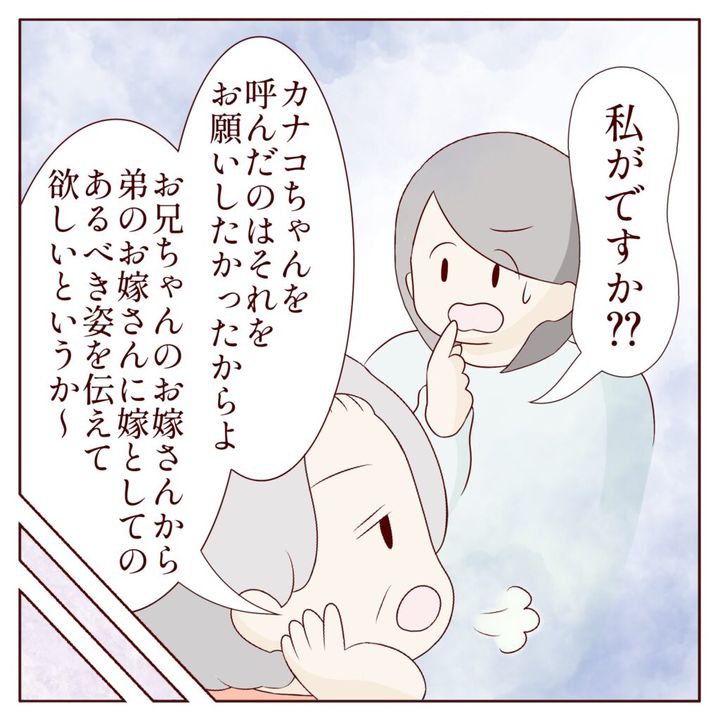 思わず「私がですか??」と驚いて聞いてしまいました。どうやらこの日私が義祖母に呼ばれたのは、ヒナちゃんのことを私に伝えるためだったようです。「お兄ちゃんのお嫁さんから弟のお嫁さんに、嫁としてのあるべき姿を伝えてほしいというか~」と言われてしまいました。えぇ・・・それはリク君とヒナちゃんが話し合うべきことだし、「仕方ないわね」と喜んでお世話してあげる義祖母も考えた方がいいのではと思ってしまいました。