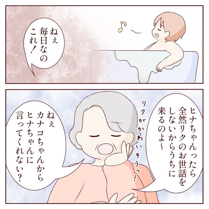 リク君がお風呂に入っている間、義祖母は困った顔をして「毎日なのこれ。」と言いました。義祖母の話では、ヒナちゃんがリク君のお世話を全然しないから来るのであり、リク君がかわいそうだというのです。そして、「カナコちゃんからヒナちゃんに言ってくれない?」と言われてしまいました。