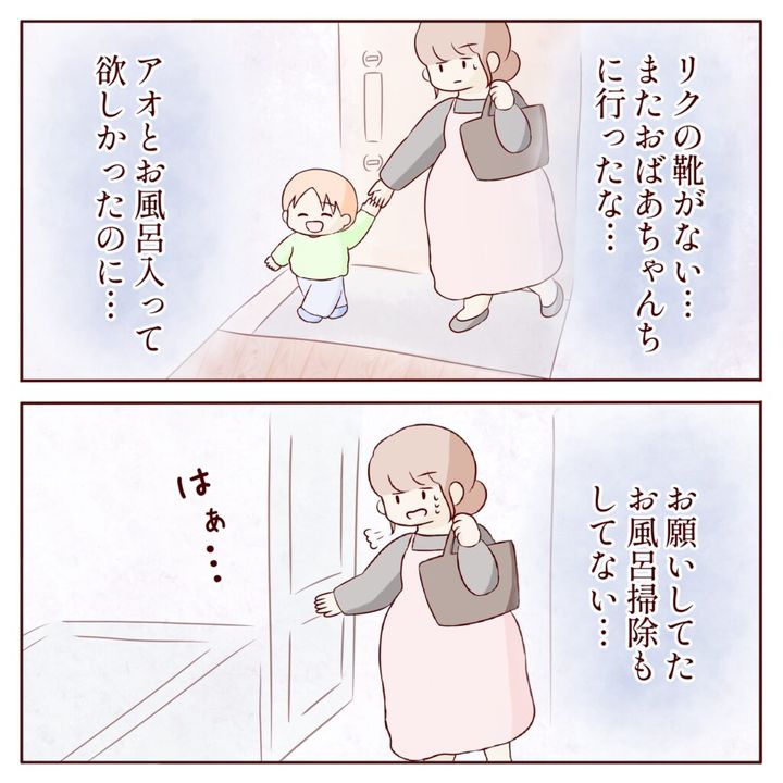 アオ君と一緒に帰ってきたヒナちゃんの姿がありました。玄関にリク君の靴がないことで、またいつものようにリク君が義祖母の家に行っていることが分かったヒナちゃんは、アオ君をお風呂に入れてもらいたかったのにと肩を落とし、お願いしていたお風呂掃除がされていないことにため息をつきました。