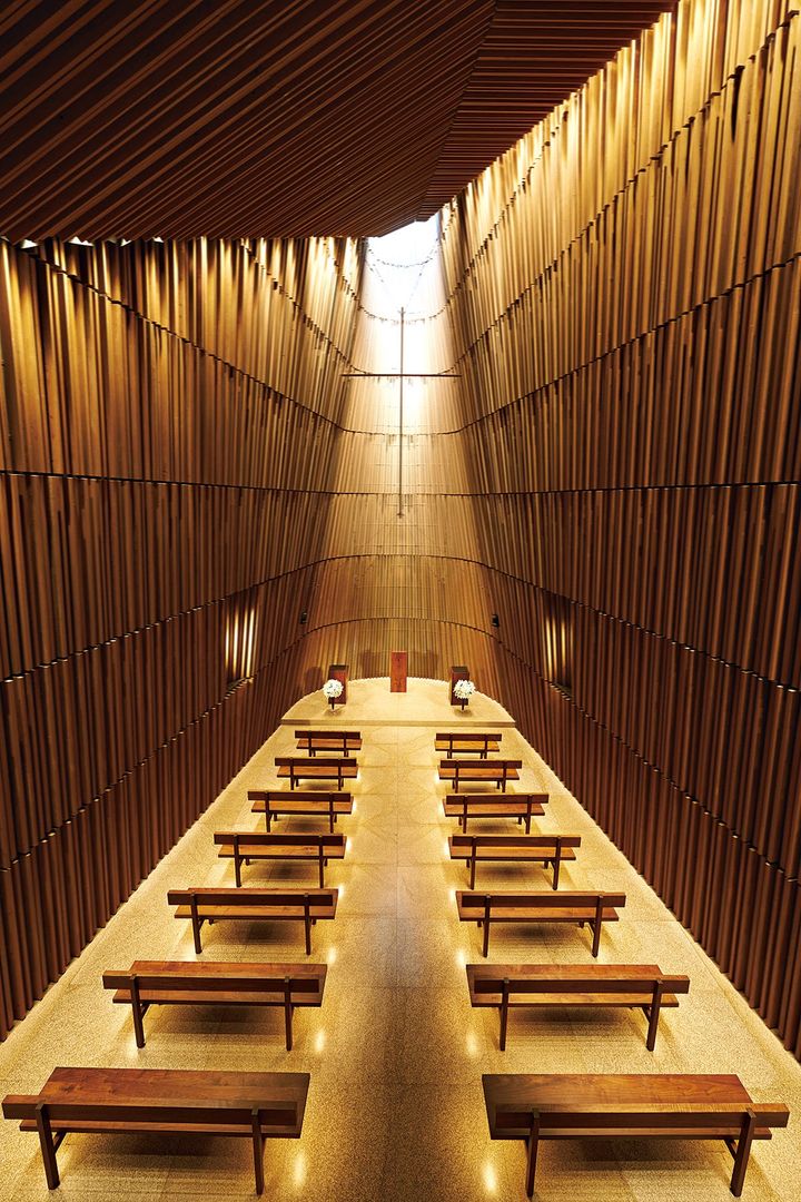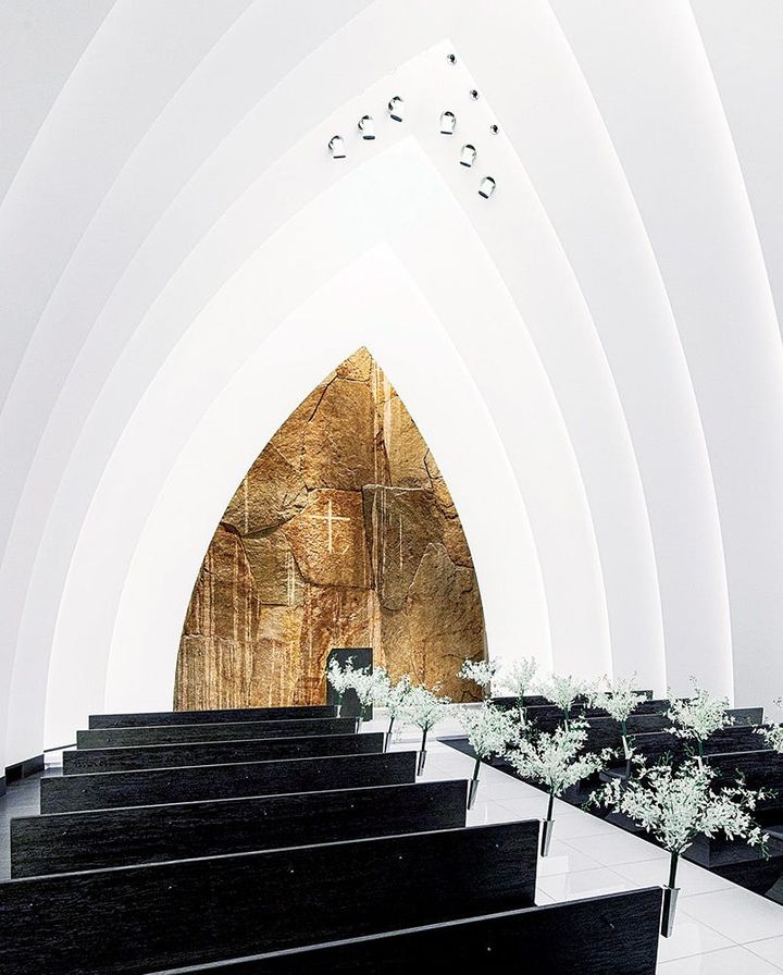 著名なデザイナー、橋本夕紀夫氏の手によるチャペル。自然の美しさとアートが融合し、モダンな空気に包まれています。天井高は約7mで、白いアーチが幾重にもなったデザインが印象的。祭壇は香川県の天然石を丁寧に組んで仕上げたもの。流れる水の音と相まって、荘厳でありながら温かみのあるセレモニーを演出します。