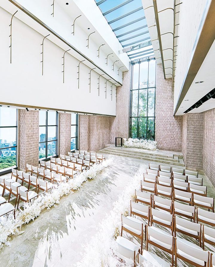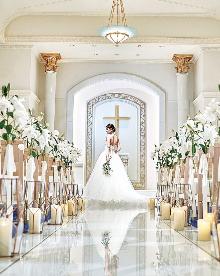 チャペルの前には回廊風のアプローチやアトリウムになっているホワイエスペースなどが備えられており、ゆったりと空間を使っているのが魅力。美しい白亜のインテリアが印象的です。輝く大理石のバージン・ロードはセレモニーに望むふたりの姿が映り込んでため息の出るような美しさ。