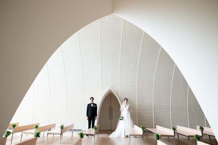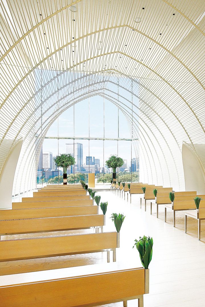 和紙をアーチ状に組んだような、独創的なデザインが目を引く「パレスホテル東京」のチャペル。繊細でアートなセンスを感じさせる雰囲気が、上質を求める花嫁に愛されています。悠久の時を刻んできた皇居外苑の緑を前に、忘れられないひとときを叶えて。洗練された開放感のある空間で、感動のワンシーンを形にします。