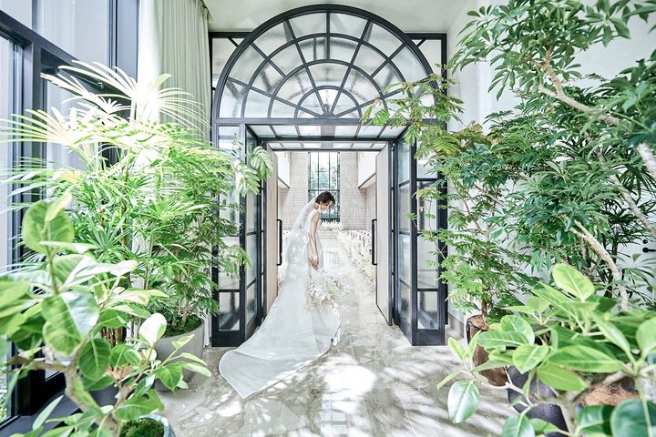 アネックス1階にあるチャペルは水中に雪が降り積もるような神秘の世界をイメージした空間。自然光が差し込み、聖壇の向こうには緑の庭園を望む美しいロケーション。チャペル前のスタイリッシュなスペースではフラワーシャワーやフォトセッションなど好みに応じて利用可能です。
