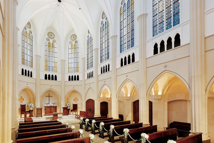 新館3階に位置する「チャペルプリエール」。フランス語で“祈り”を意味する名前が付けられており、ゴシック様式のインテリアはステンドグラスや石材に至るまで本場ヨーロッパから取り寄せたもの。バージン・ロードを静かに進む花嫁の後ろ姿はゲストの心にも深く残るはず。