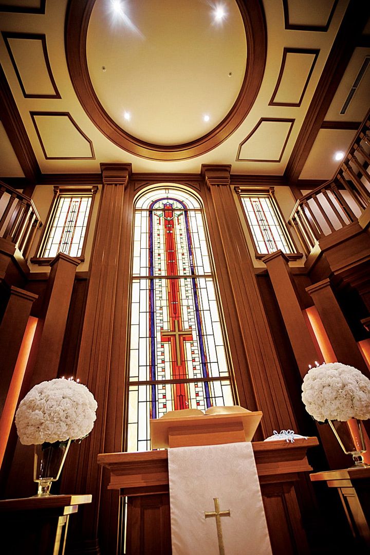 ホテルの4階に位置するチャペルは温かみのあるエレガントな雰囲気。祭壇前に飾られたステンドグラスは、ホテルの二代目本館の設計にも携わった20世紀を代表する建築家、フランク・ロイド・ライトのデザインをモチーフにしたもの。神聖な式を彩る大切なピースとなっています。