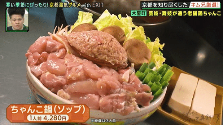 1軒目は、木屋町にある老舗のちゃんこ鍋店。芸妓さんや大物歌手も通うこちらの名物は「ソップ」と呼ばれる鶏ちゃんこ鍋。兼近を「関西ですね〜」とうならせた、鶏ガラベースの甘めのスープによく合う鶏の肉団子には、食欲をそそるパンチのきいた隠し味が…。