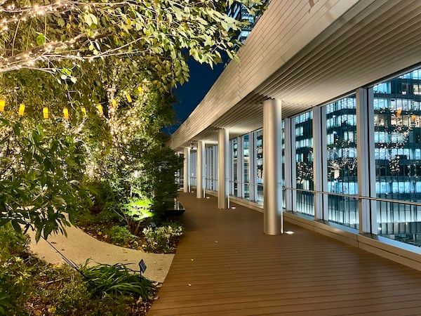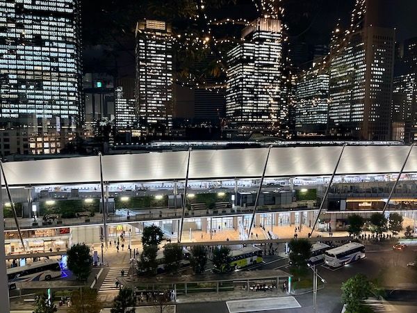 意外と普段立ち寄らない場所かもしれませんが、5FのYAESU TERRACEから見る夜景も素敵です。東京駅のホームまでしっかり見えながら、イベントの幻想的な灯りに癒される穴場スポット。鉄道好きなので、夜に浮き彫りになる駅のホームのある光景に断然癒されました。こちらは2026年2月15日まで。