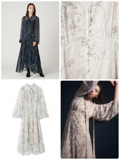 1枚でドラマティックに着映える星座モチーフ。繊細なプリントが上品な華やぎを与えます。洗練されたLGRY、優しいLBEG、シックなNVYの3色をご用意。