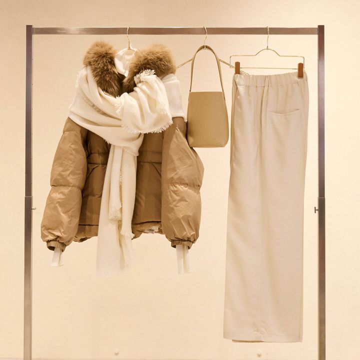 <YVES SALOMON>のダウンジャケット187,000円、<Deuxième Classe>のスウェット26,400円、<Deuxième Classe>のタートルネックニット25,300円、<ALONPI>のストール105,600円、<THE ROW>のバッグ262,900円、< Deuxième Classe >のパンツ53,900円