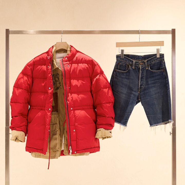 <Ienki Ienki>のダウンジャケット220,000円、<GESHO STUDIO>のシャツ308,000円、<KATHARINE HAMNETT>のTシャツ19,800円、<VINTAGE>のデニムショーツ55,000円