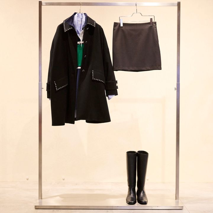 <MACKINTOSH>のコート172,000円、<ACNE STUDIOS>のポロシャツ110,000円、<L’Appartement>のシャツ41,800円、<AP STUDIO>のミニスカート26,400円、<GRAIN>のロングブーツ46,200円