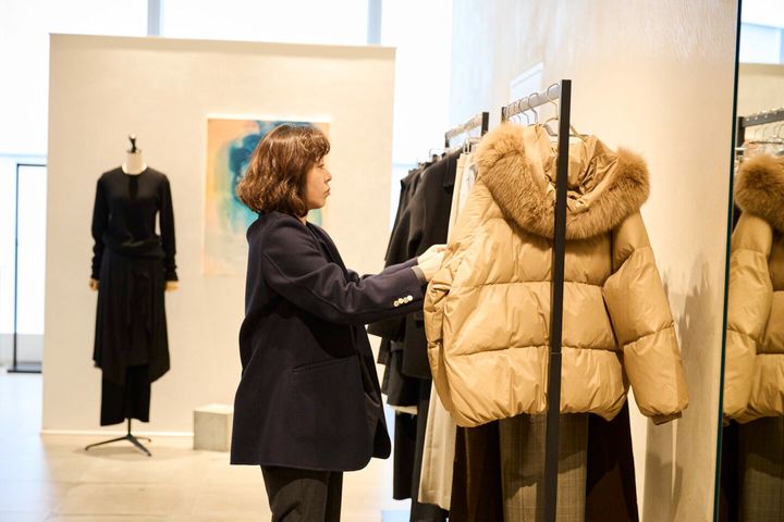 「こんなにコンパクトで、バランスがいいダウンって珍しいんです」と加藤さん。「パネルのピッチが短く、ダウンの入れ方も美しく、ボリュームが出すぎずさらりと着られるシルエットが魅力。ウエストを絞るとエッジィに着られるし、そのままふんわり羽織っても可愛い」。