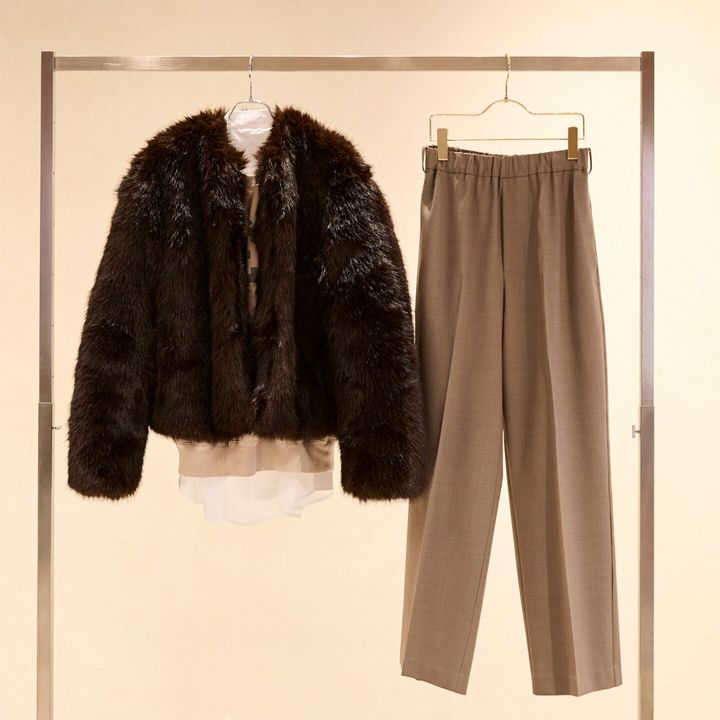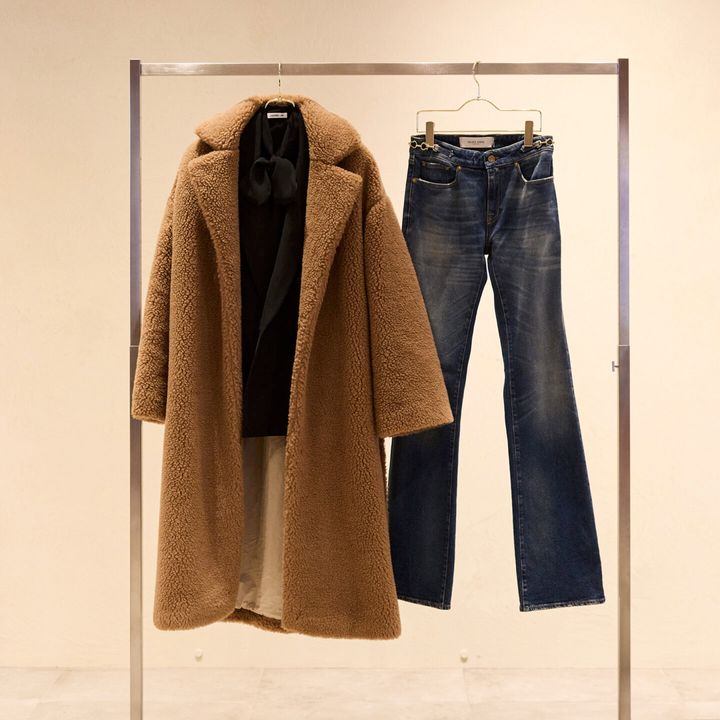 ホリデーシーズンの主役にふさわしい、リッチなボア素材のロングコート。「毛足が長すぎずコンパクトな設計で、重く見えがちなボアでもスマートに着こなせるのが魅力です。レストランでアウターを預けたときに、“いいコートですね”と言われたい一着」。