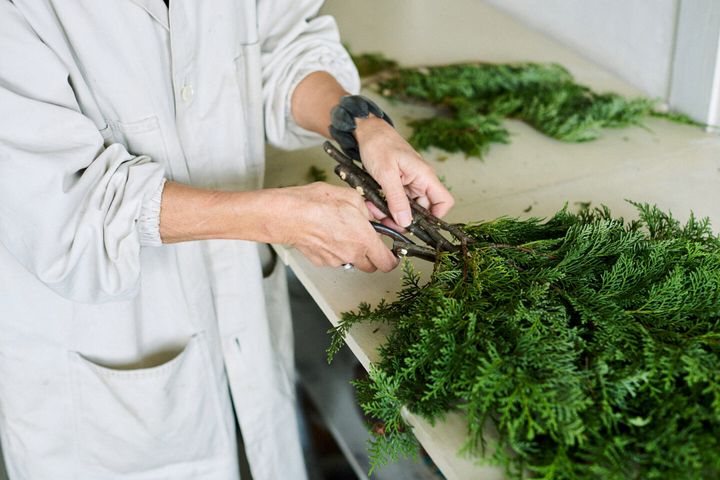 「ご縁があり、加子母の森から分けていただいたヒノキを束ねたスワッグを数年前から製作しています。実際に葉っぱに触れると感じていただけるのですが、香りが豊かで、なんだかとても健やかなエネルギーが伝わってきます。神聖な植物を束ねて、その場を清めるという願いを込めて「場守り」と名付けました。同じく生き生きとした枝葉と束ねて、仕上げに古代より神事や日常生活に使われてきた日本の伝統素材である精麻の紐で根本を結び、完成です」