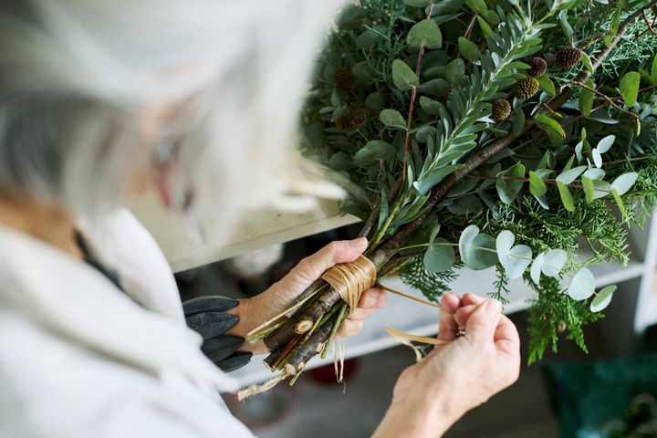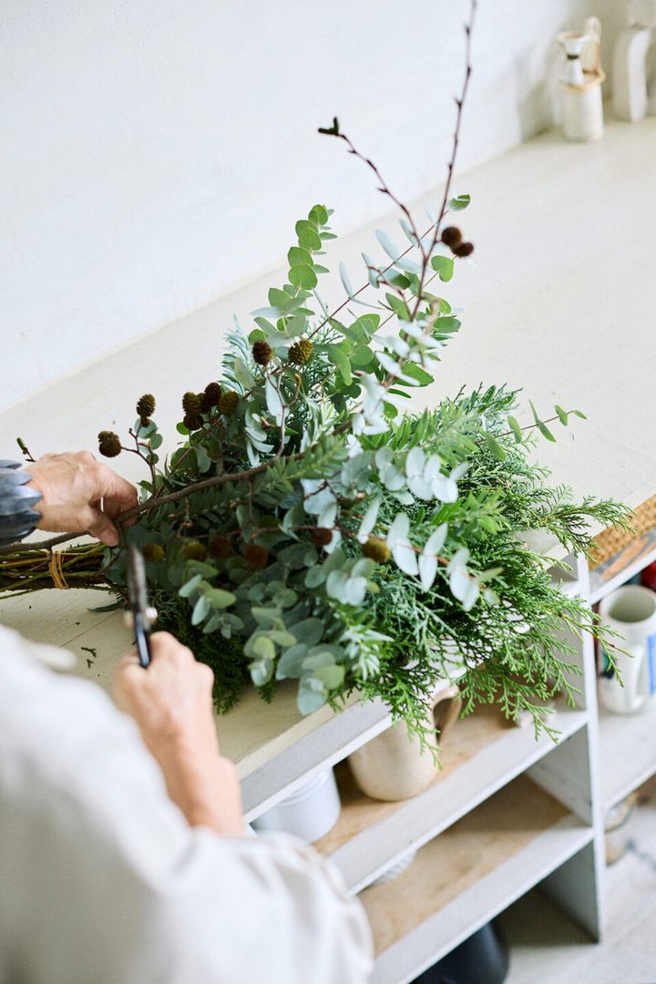 例えば、ホリデーシーズンは、クリスマスリースや正月飾りの代わりに新年の平安と繁栄を祈願する縁起物として飾られることも増え、さまざまなスワッグがフラワーショップの店頭に並んでいるが、他と一線を画す“贅沢さ”を味わえるのが、フラワーデザイナーの市村美佳子さんが手がける「場守り」。