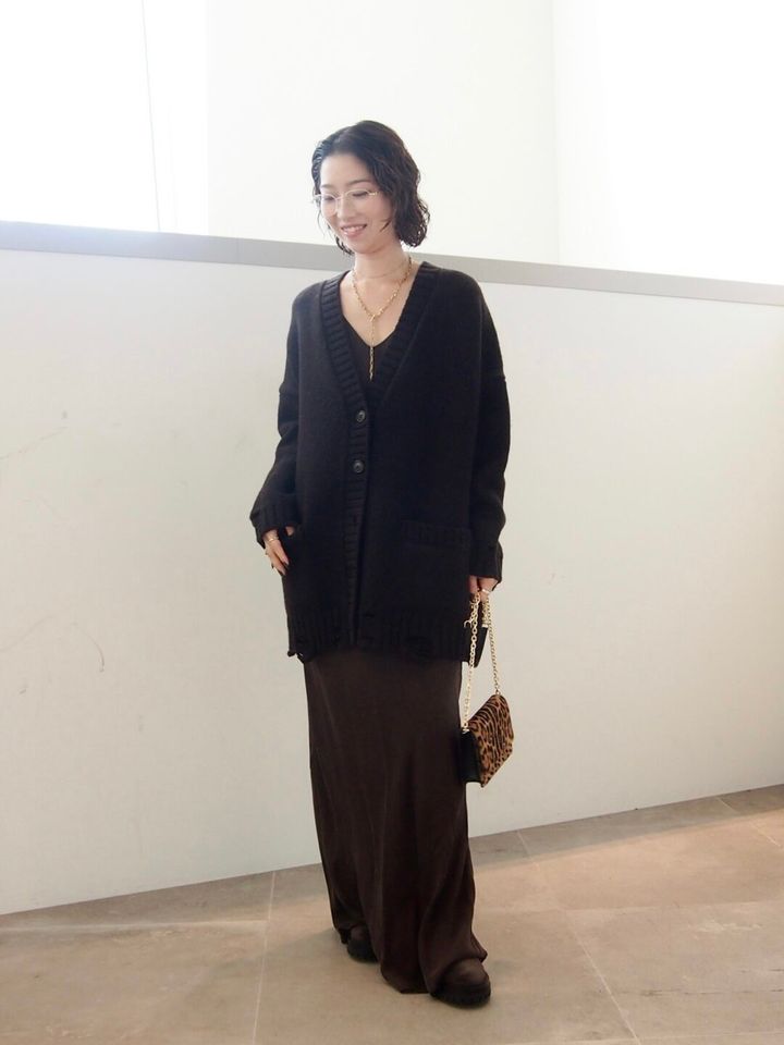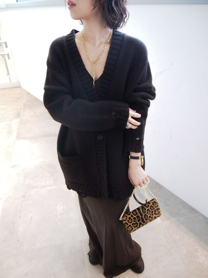 今年もタフなテイストを取り入れたい!ダメージカーディガンを女っぽい艶のあるワンピースとミックス。い素材のスウェードブーツと合わせることでトレンド感をプラス。