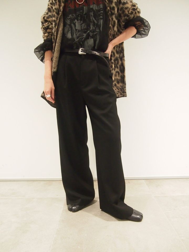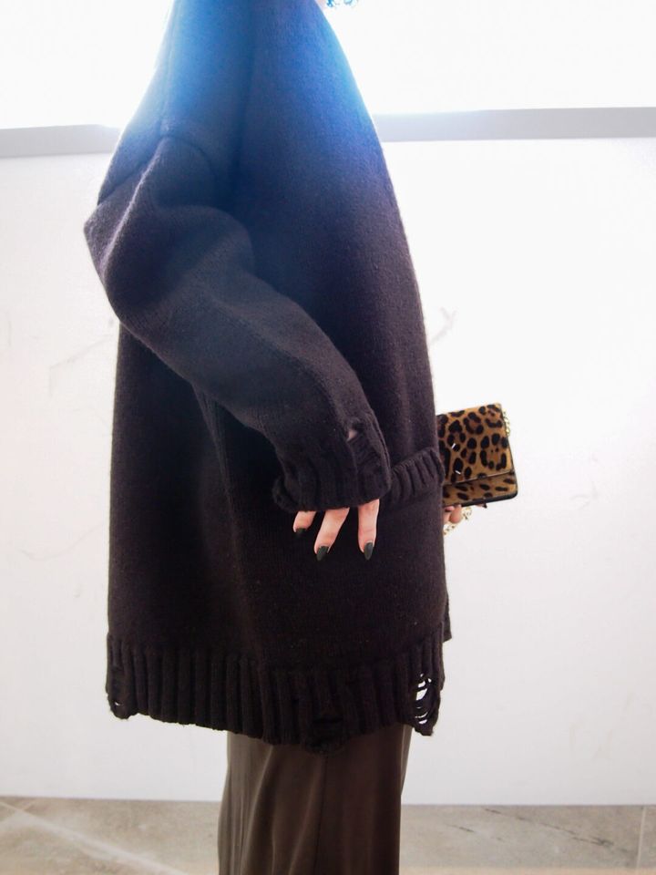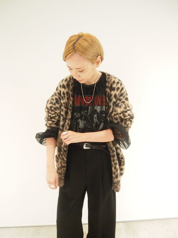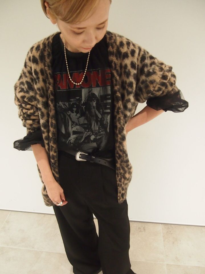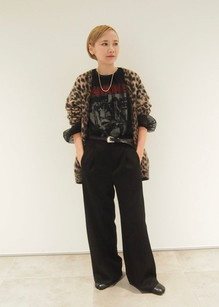 去年も展開していてずっと欲しかったLANEUSのレオパードカーディガン。ロックTと甘めなチュールブラウスを重ねるだけでMIX感あるスタイリングに。毛足の長いカーディガンで素材のMIXを楽しんで、パンチのあるトップス合わせには形の綺麗なスラックスでバランスを取っています!