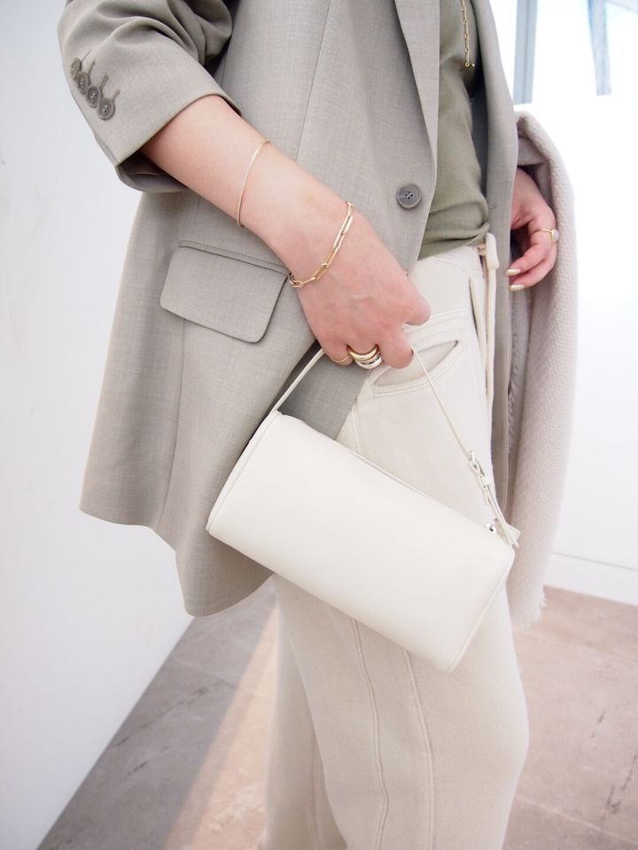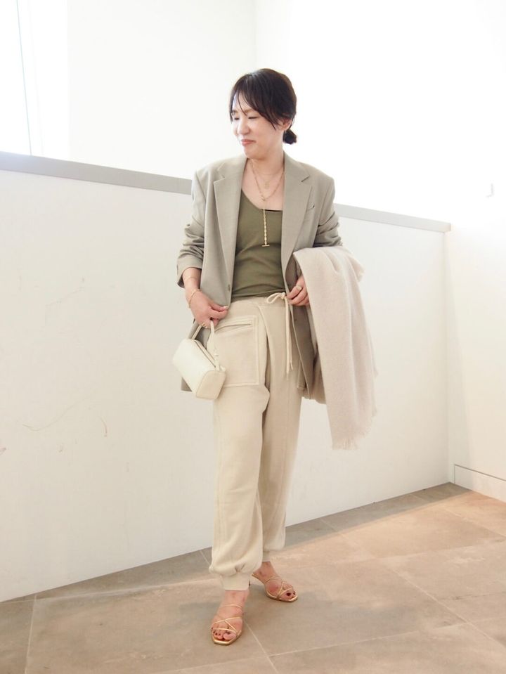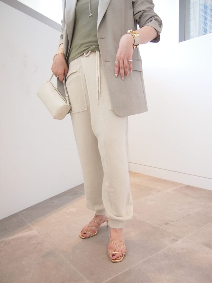 ニュアンスカラーがやっぱり気分!ウェストがクロスしたデザインが他にはないR13のスウェットPT。きれいめなジャケットと合わせてワントーンでスタイリング。足元はブーツやヒールなど色々なバランスに挑戦したい!