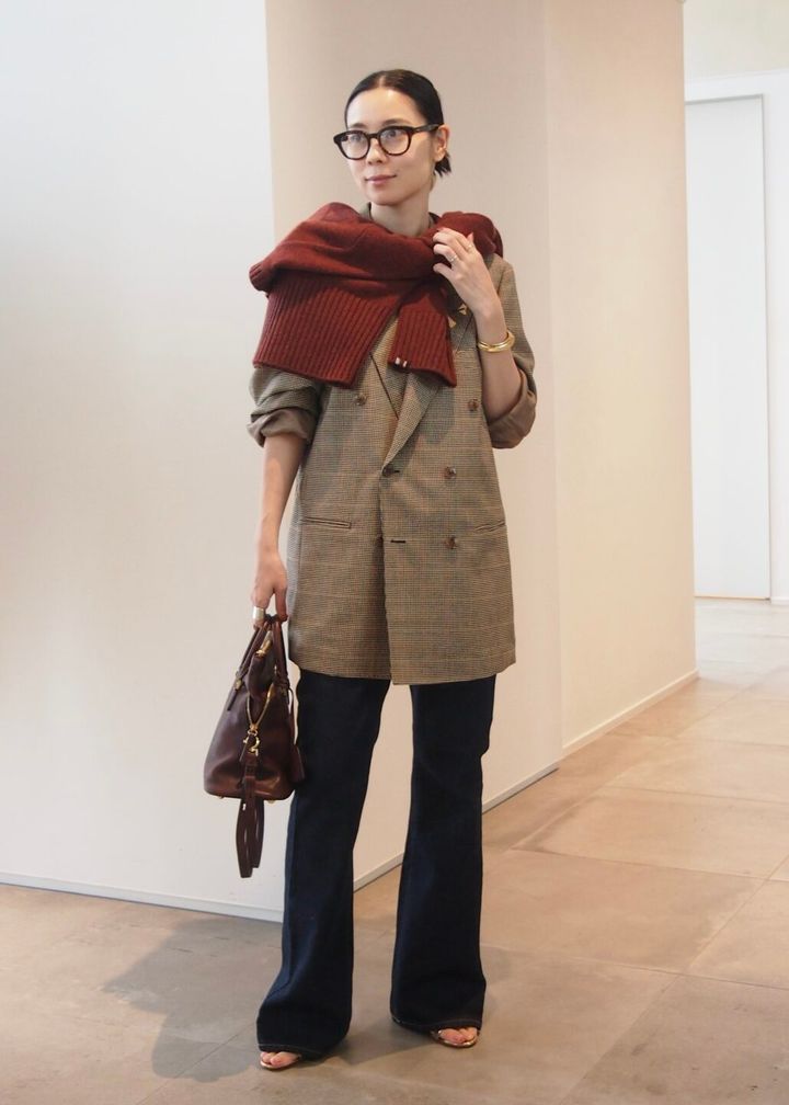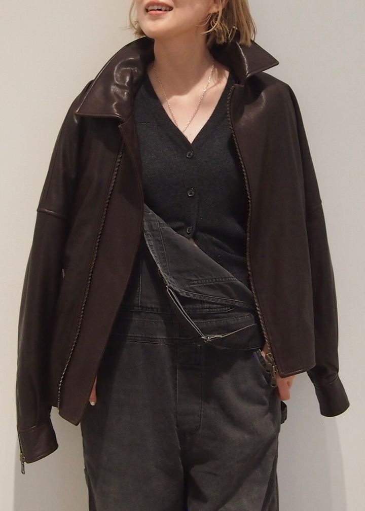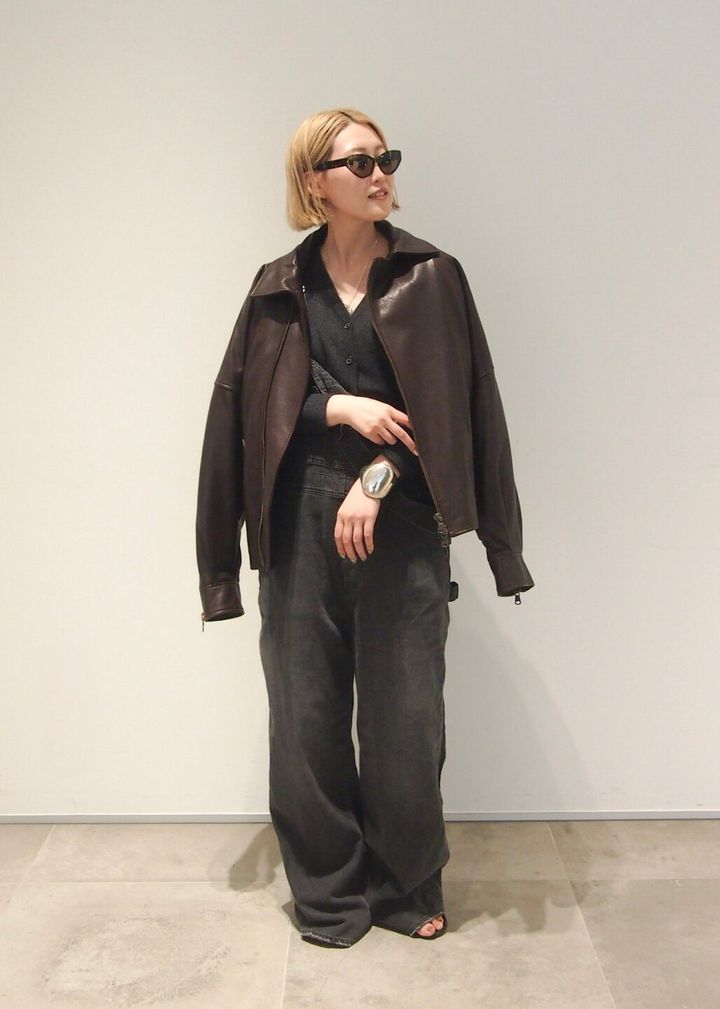 今年はブラウンカラーの気分!PETAR PETROVのレザージャケットは柔らかなレザーに内側にシュッとしたシルエットでブラックコーデにも映えるアイテム。デニムのオーバーオール合わせにカジュアルになりすぎないように空きのあるカーディガンを合わせて抜け感を出しています。クリーンな印象になるようにシルバーアクセで艶感を出しています。