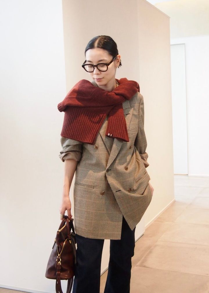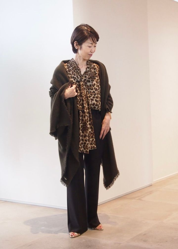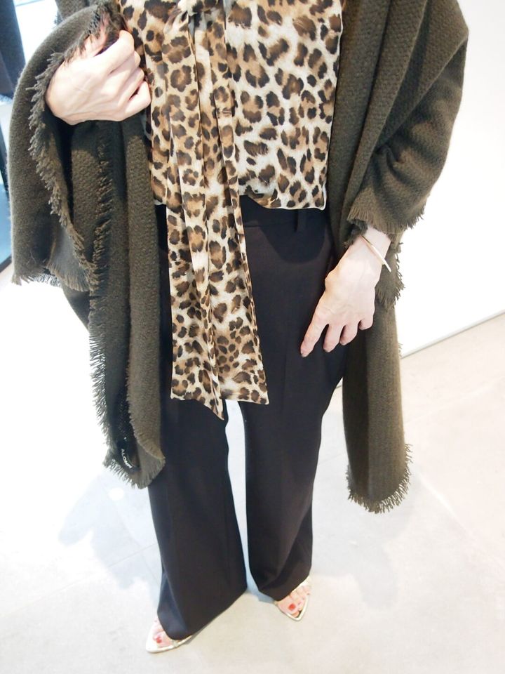 アイキャッチになるレオパード使いもおすすめですが、さりげない柄使いが私はおすすめ!カーキのストール合わせで柔らかな雰囲気が惹き出るようなスタイリングにしてみました!