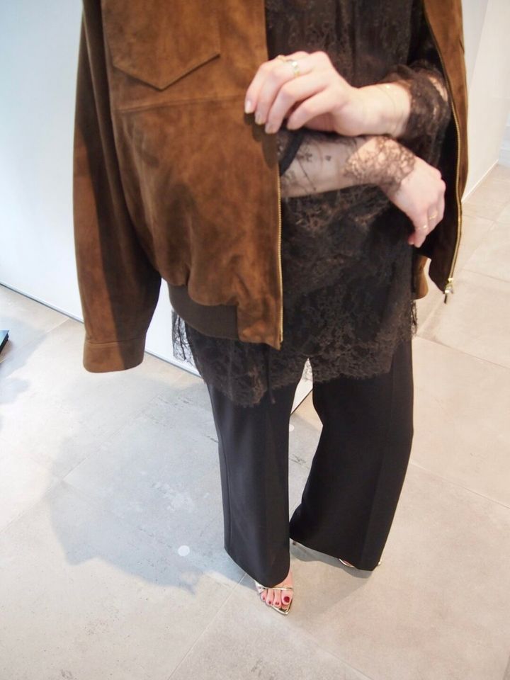 スウェード×レースの素材合わせのトレンドを取り入れたい!タフなスウェードアイテムのは抜け感を出すポイントです。艶のあるサンダルを合わせて抜かりなく女性らしさ出るスタイリングにしています!