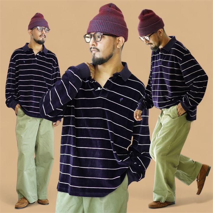 ポルトガル製コットン100%のベロアロングスリーブポロシャツ。ボックスシルエットで丈が長過ぎず女性でも着やすいアイテムとなります。柔らかい肌触り心地で秋っぽい生地感でコーディネートに取り入れると季節感を出してくれる一着となります。