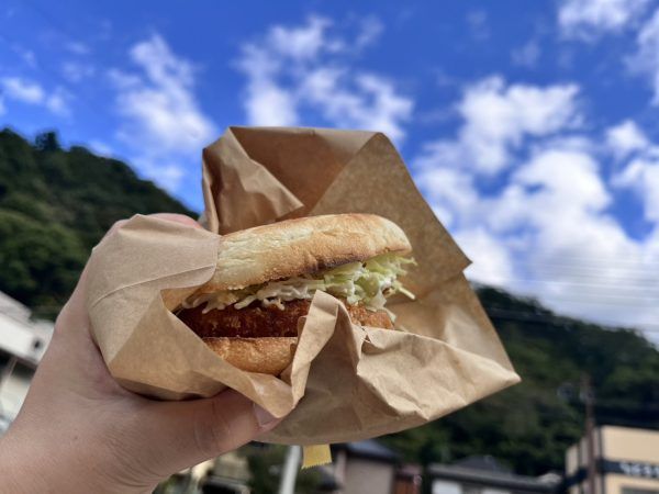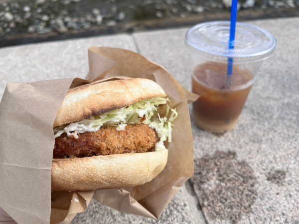 八王子市めじろ台のパン屋、ファリーヌさんに特注で作ってもらったフォカッチャに、弾力もあってダシも染み込んでいるくるま麩カツ!