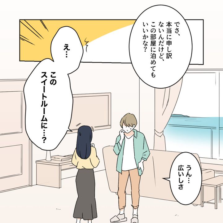 ショウタさんに招待されて結婚式に参列するために沖縄へやってきた義父ですが、自分で予約すると言っていたホテルを予約していませんでした。それを知ったショウタさんは、あろうことかマミさんと二人で泊まる予定のスイートルームに義父を泊めたいと言い出し、マミさんが抵抗すると大きなため息をついて「わかったよ。母さんに一度聞いてみるから」と一旦引き下がりましたが、了承しないマミさんが悪いかのような態度を取るショウタさんにマミさんはモヤモヤ。