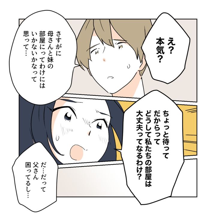 「え?本気?」そう聞き返すと、「さすがに母さんと妹の部屋にってわけにはいかないかなって思って・・」と義母たちを気遣うショウタ。「ちょっと待って。だからってどうして私たちの部屋は大丈夫ってなるわけ?」私への気遣いは一切ないショウタに愕然としながら詰め寄ると、「だ・・だって、父さん困ってるし・・」と義父を心配するショウタ。