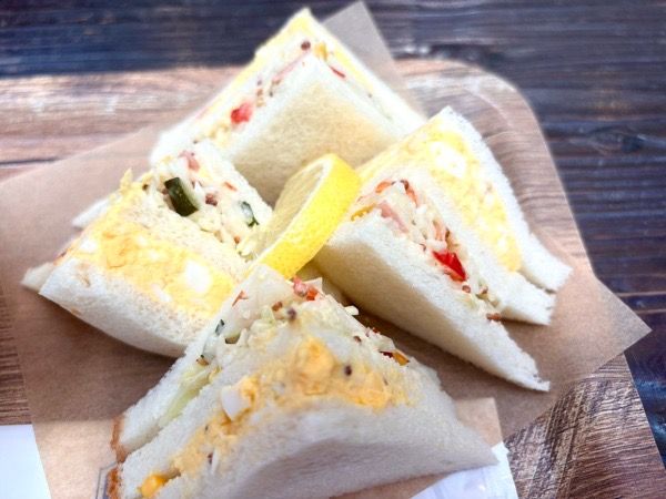 サンドセットは、野菜と卵のサンドイッチがついています。卵も野菜もたっぷり入っています。カットレモンをしぼるとさらに爽やかな味になり、朝から気分が上がります。