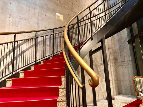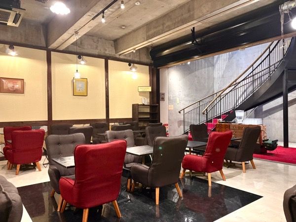 シックで重厚感がある建物すべてがカフェなんです。地下2階から2階まで4つのフロアからなり、座席は100席以上もあります。現代風の外観とは異なり、一歩中に入れば優雅にクラシックが流れ別世界へといざなってくれます。地下はらせん階段でつながり、赤い絨毯とコンクリートの壁がなんとも言えない世界観を醸し出しています。ここが三宮のど真ん中とは思えないほどの贅沢空間です。空いていれば自分でフロアを選ぶことができ、1階のレジでオーダー後は、座席までトレイを運んでくれるのも嬉しいサービスですね。