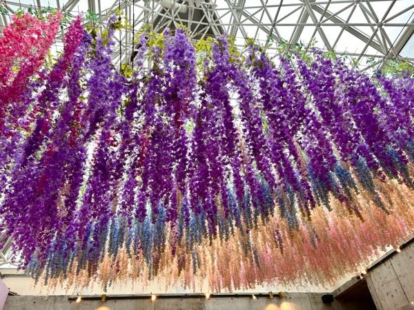 とくにSNSで話題になっているのが2階席。天井一面に藤の花が降りそそぎ、太陽の光が差し込むと花びらがきらきら輝いて見えます。優雅な空間は解放感にあふれ、日常の喧噪を忘れるほどです。