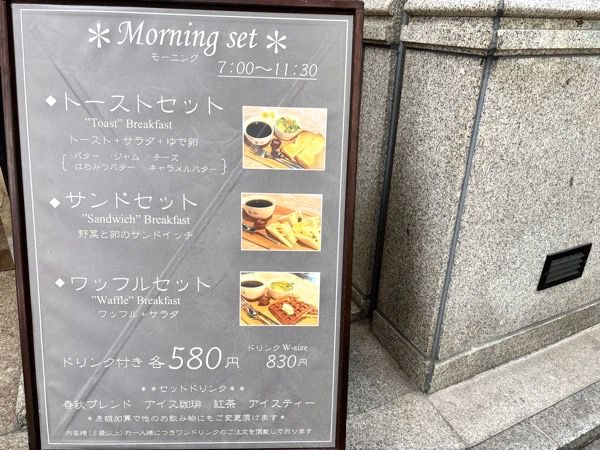 モーニングは朝7時から11時半までで、メニューはトーストセット、サンドセット、ワッフルセットの3種類から選べます。ドリンク付きでなんと破格の580円!(ドリンクWサイズは830円)こんな贅沢広々ゆったり空間なのに!? コスパ最強ですよね♪
