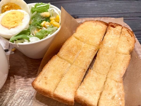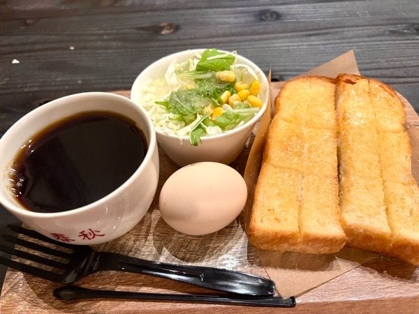 トーストセットはトーストにサラダとゆで卵がつきます。トーストはバター、ジャム、チーズ、はちみつバター、キャラメルバターから選ぶことができます。こんがりと焼けたトーストにはちみつバターがたっぷりかかり、じゅわっと甘さが口に広がります。 コーヒーの春秋ブレンドは自家焙煎したオリジナルブレンドで看板の「自家焙煎珈琲専門店春秋」の名の通り味わい深いです。