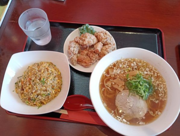 もう一人の家族は、一番星スペシャルを注文。 醤油ラーメン、唐揚げ、半チャーハンのセット(1380円)。 リーズナブルな価格が嬉しいです。 からあげはサクサクで5個入りでボリュームがあります。