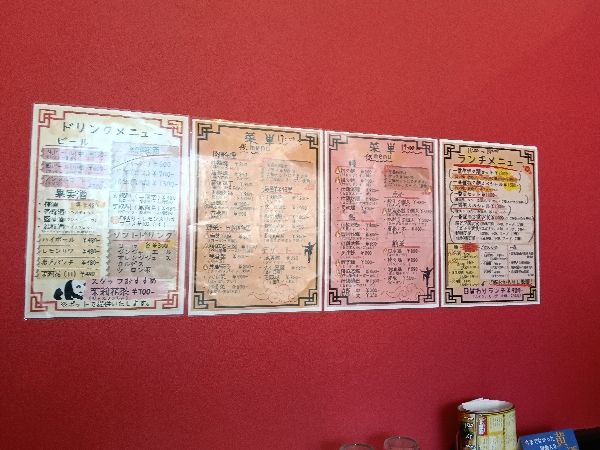 テーブル席の壁にはメニューが貼っています。 ランチメニュー、夜の一品料理などの中華のメニューの種類が豊富です。