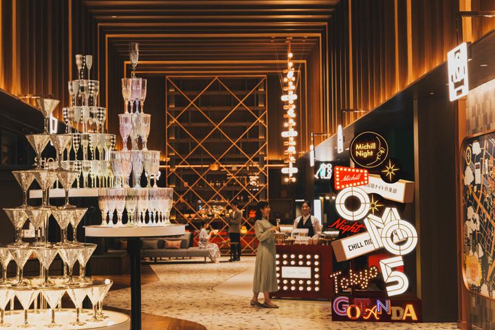 「OMOベース」のネオンやシャンパンタワーなどの華やかな装飾で、五反田という街の魅力を表現している。