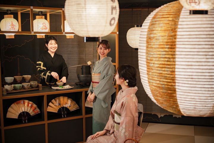 京都で300年の歴史を誇る「鍵善良房」の和菓子の中から、舞妓さんのおちょぼ口でも食べやすい一口サイズの和菓子や季節の羊羹が供され、OMOレンジャーが点てる「祇園辻利」の抹茶とともに味わうことができる。