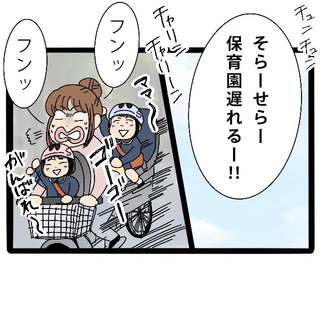 「そらーせらー!保育園遅れるー!」あれから、新しい保育園に転園したそらとせら。家からは少し遠くなってしまいましたが、毎朝必死に自転車を漕いで送り迎えをしています。