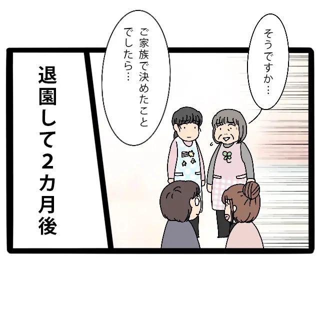 迷惑をかけたすべての人に謝罪を終えたあと、私たちは正式に園長先生へ退園の申し出をしました。園長先生は少し残念そうな表情を浮かべるも、「そうですか、ご家族で決めたことでしたら・・・」と言って静かに頷きました。こうして、私たちはお世話になった幼稚園を退園したのです。