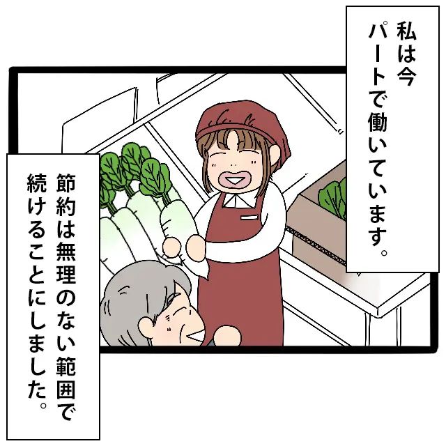 マイホームの購入資金を貯めるために、もらったおさがりを別のママ友に売ってお金を稼いでいたルミ子さん。しかし、夫の和彦さんから「人様に迷惑をかけて建てた家なんていらない」と言われ、我に返ります。今まで迷惑をかけたすべての人に謝罪をし、けじめとして退園を選択しました。それから2ヵ月後。そらくんとせらちゃんは新しい保育園に転園。ルミ子さんはと言うと、パートで働きながら、コツコツとマイホームの購入資金を貯めています。大好きな節約も、これからも無理のない範囲で続けていくそうです。みなさんも節約はほどほどに!