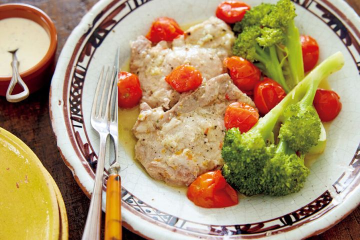 ブロッコリーはピーラーで茎の皮を厚めにむき、縦半分に切る。ミニトマトはへたを取る。豚肉は水けを拭き、脂身と赤身の境目にところどころ包丁の刃先を刺して筋を切る。〈ヨーグルトマヨソース〉の材料は混ぜる。