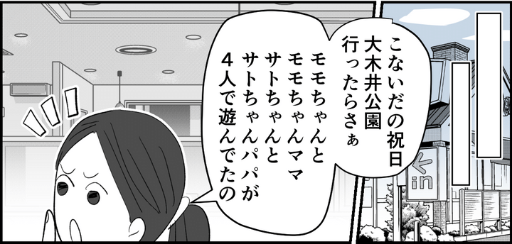 私はカンナ。今日は旦那と一緒に、幼稚園の年中になる息子・スグリを、少し遠くの公園に車で連れてきています。そうしたら、同じクラスのサトちゃんのパパ・コウジさんとモモちゃんのママ・ユウコさんが自分の子どもを連れて、その公園にいたのです。コウジさんはいつもサトちゃんを送り迎えしていますが、さすがに休日にまでほかのママさんと2人で出かけるなんて……怪しすぎると思いませんか? 前から2人の距離感が気になってはいましたが……。
