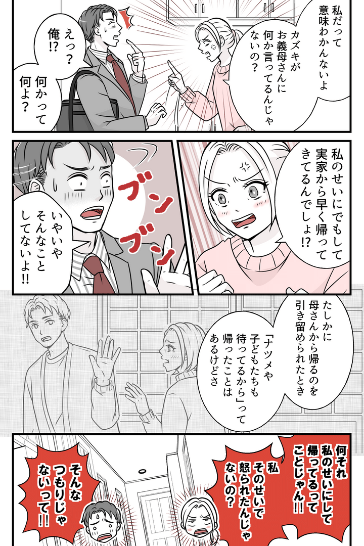 私は「カズキが早く帰るのを自分のせいにされた」と憤りましたが、カズキは私ひとりに育児を押し付けたくないからだと説明。カズキの発言が義母に誤解されてしまった可能性も示唆されて、ようやく私も少しだけ冷静になれました。