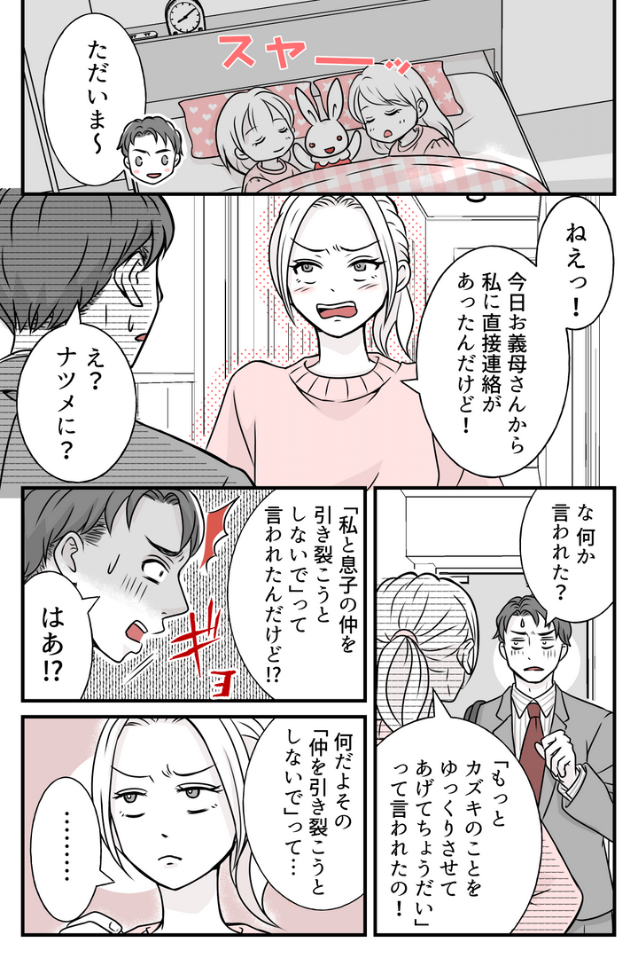 私はナツメ。夫のカズキとのあいだには幼稚園に通う娘が2人(年長のハナ、年少のリン)います。ひとりで義実家へ行くようになったカズキでしたが、用事が済むとすぐに帰宅してきます。そんなある日、私のスマホに義母から着信がありました。恐る恐る電話に出ると「もっとカズくんをゆっくりさせてあげて!」と言われ、私は困惑してしまいました。どうやら義母はカズキがすぐに帰ってしまうのが不満なようで、私が「早く帰ってきて」と頼んでいると決めつけていたようです。義母は私をひと通りなじると、一方的に電話を切ってしまいました。理不尽な内容に最初は呆然としていましたが、今はだんだんと怒りがこみ上げています。