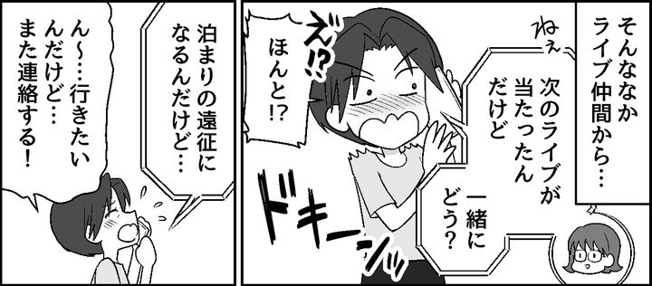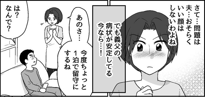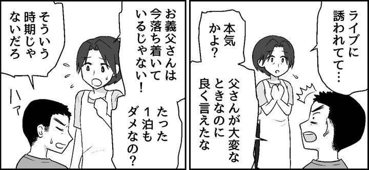 推し仲間に誘われたライブは、自宅から飛行機で行く距離でした。もちろん泊まりでの遠征になります。さすがに夫に黙って留守にするわけにはいきません。義父の病状が落ち着いている今なら……! 私はなるべくサラッと切り出します。