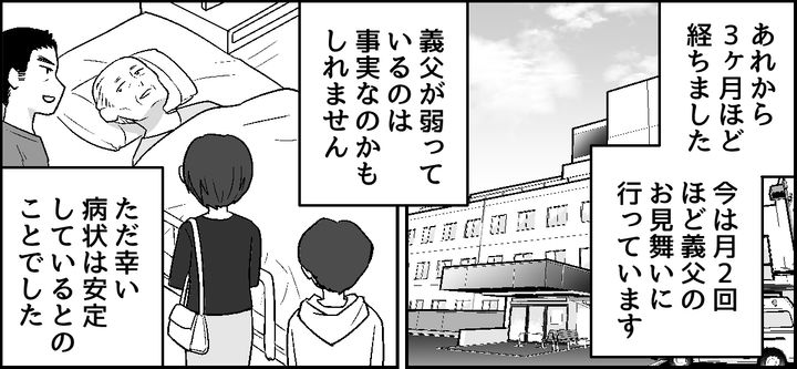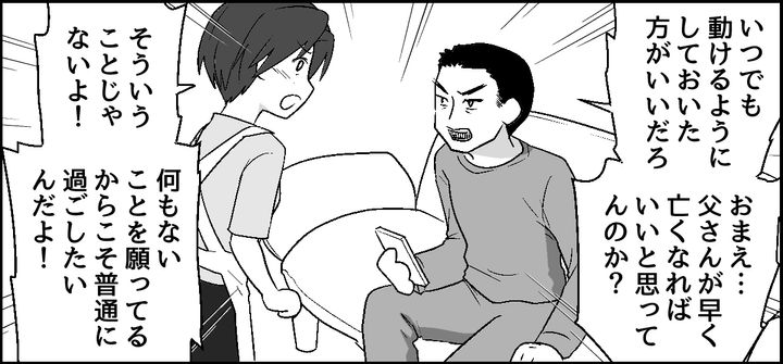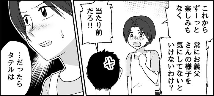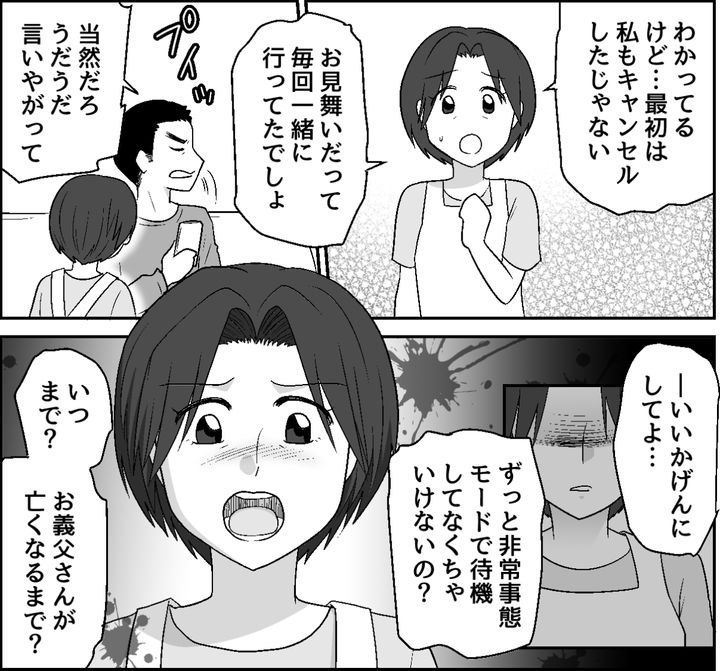 私が思わず反論すると、夫は叱りつけてきました。けれど私が義父の死を待っているなんてありえません。むしろ何もないことを願っているからこそ、普通に過ごしていたいです。仮に私の母が同じ状況でも、絶対に何もしないくせに……! 夫の身勝手な言い分に、なんだか疲れると同時にウンザリしてしまいました。